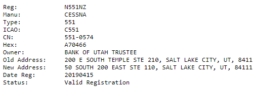 A third source stated the following; that he had filmed a 1988 Cessna 551-0574 engine registration and call sign N551NZ (previously N22AA) owned by the Bank of Utah. This flew in from Australia and landed at Ardmore. It then departed to Hamilton then Masterton, then Queenstown then on to Masterton and then back to Ardmore.