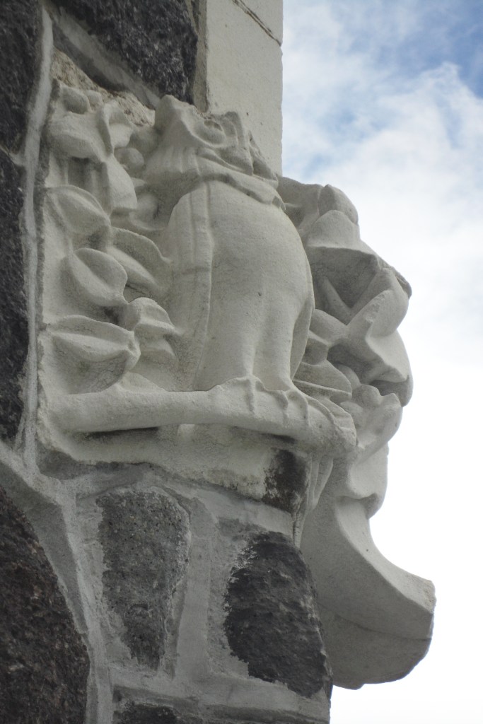 The tower includes , on its corners, esoteric grosteques including the owl of minerva (or noculi) the familar asociated with the Roman Athena the god of war and wisdom plus a homage to father time.