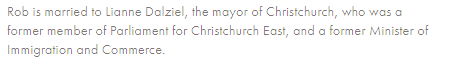 Davidson & Associates notes on the company’s own web site “Rob is married to Lianne Dalziel, the mayor of Christchurch, who was a former member of Parliament for Christchurch East, and a former Minister of Immigration and Commerce”.