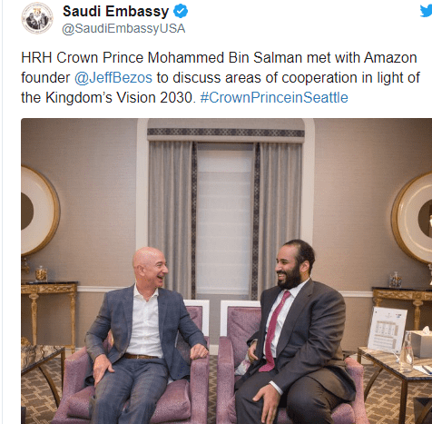 What is known is that Jeff Bezos was publicly on good terms with Crown Prince Mohammed Bin Salman was in Riyadh back in September 2016 on the eve of Saudi Arabia’s elections. This is when Saudi Press Agency said Bezos was in the kingdom to “discuss fields of cooperation and investment opportunities available according to the Kingdom’s Vision 2030,” as sex trafficker and shadow banker Jeffrey Epstein also showed up the scene.