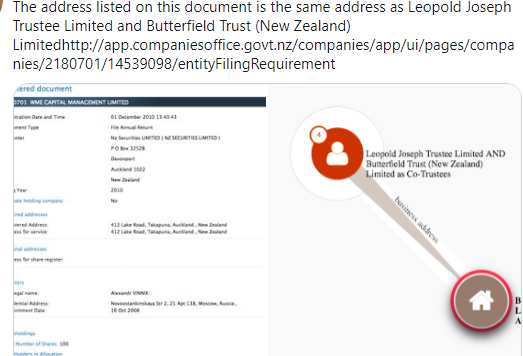 The same NZ address, used by Vinnik, has revealed hundreds of offshore companies listed on the International Consortium of Investigative Journalist Paradise Papers. While Vinnik’s company address, 412 Lake Road Takapuna Auckland, was also the address used by SWISS FINANCE CORPORATION LIMITED which was subject to a 2011 New Zealand Reserve Bank warning.