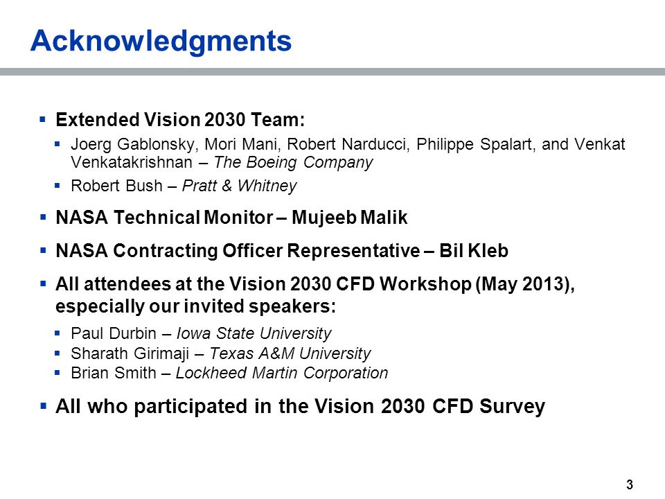 Extended Vision 2030 Team: Joerg Gablonsky, Mori Mani, Robert Narducci, Philippe Spalart, and Venkat Venkatakrishnan – The Boeing Company. Robert Bush – Pratt & Whitney. NASA Technical Monitor – Mujeeb Malik. NASA Contracting Officer Representative – Bil Kleb. All attendees at the Vision 2030 CFD Workshop (May 2013), especially our invited speakers: Paul Durbin – Iowa State University. Sharath Girimaji – Texas A&M University. Brian Smith – Lockheed Martin Corporation. All who participated in the Vision 2030 CFD Survey