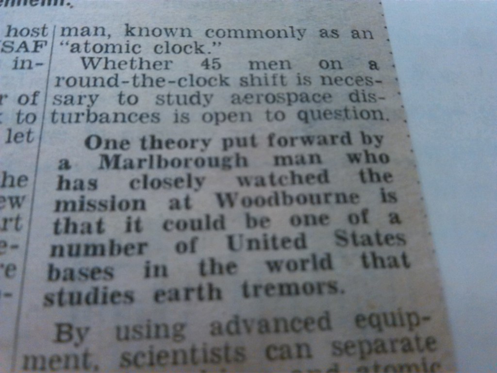 | 6. | A microbarograph for measuring short term air pressure variation. Official statements have never gone beyond saying that this station studies ‘aero-space disturbances and their effects on radio communications’ although the Prime Minister did once admit that the ‘disturbances’ might include nuclear explosions. (21/6/63). All the equipment known to operate at Longbank would be compatible with explanation that the base participates in the detection and identification of nuclear explosions in the earth’s atmosphere and in space. This interpretation is fully developed and documented in a paper ‘Report on USAF Base at Woodbourne’ prepared for the N.Z. University Students Association. Copies are available. |