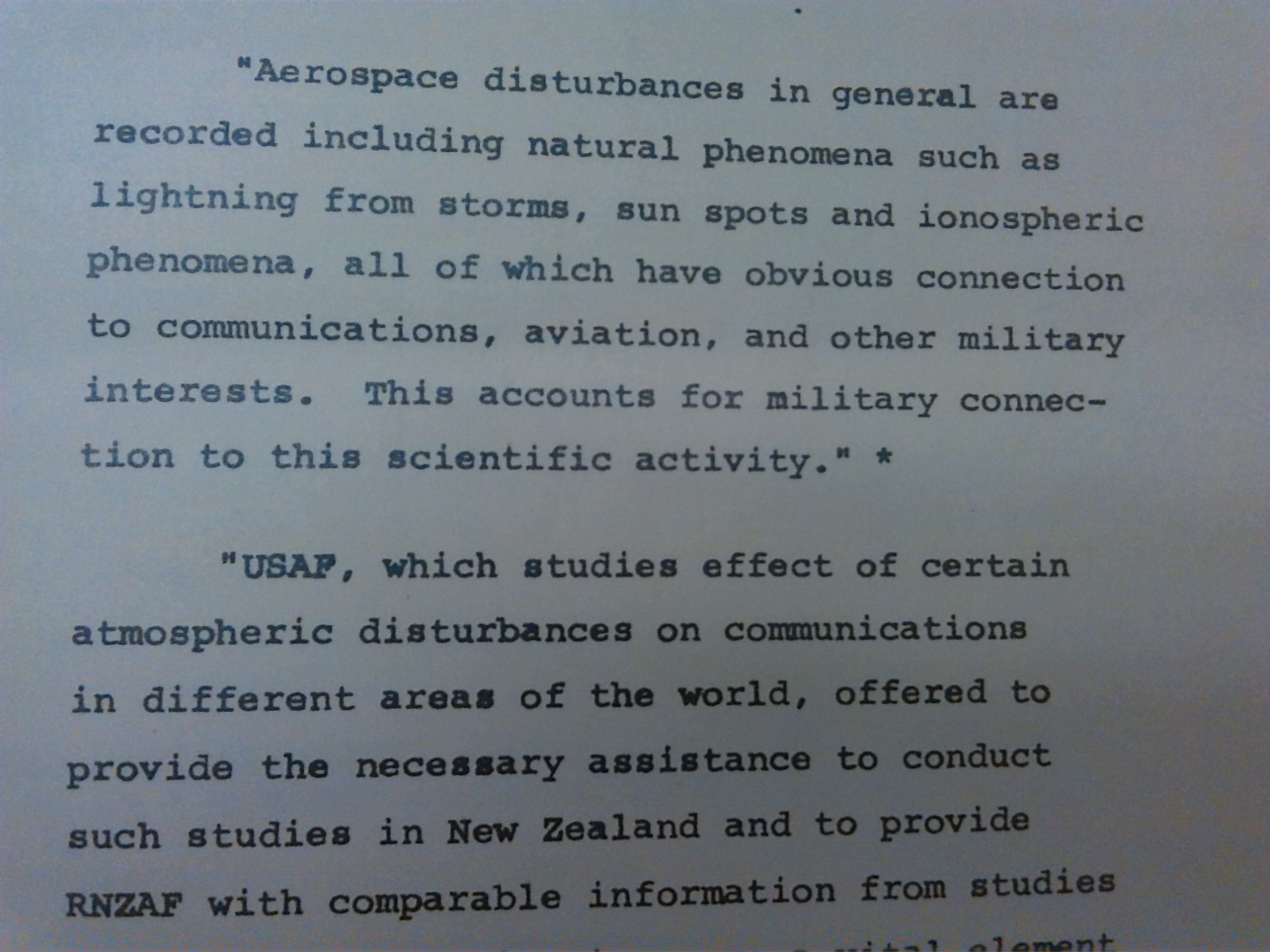 American military New Zealand University funded space projects were all involved in what New Zealand researcher Owen Wilkes in his 1973 book ‘Protest’ termed “Geo-warfare” in relation to his reporting on similar atmospheric focused military research being conducted in Blenheim (were classified research dates back to WWII) by the US Air Force Project Long Bank in the 1970’s – Work that was so classified even the New Zealand government admitted it had no idea what it did.