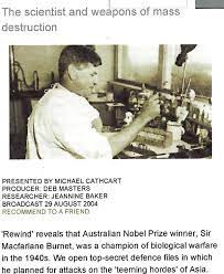 In 1954 Sir Macfarlane Burnet, the Nobel prize winner secretly urged the government to develop biological weapons for use against Indonesia and other “overpopulated” countries of South-East Asia. A revelation contained in top-secret files declassified by the National Archives of Australia (despite resistance from the Department of Foreign Affairs and Trade) show Macfarlane recommended in 1947 for biological and chemical weapons be developed to target food crops and spread infectious diseases.