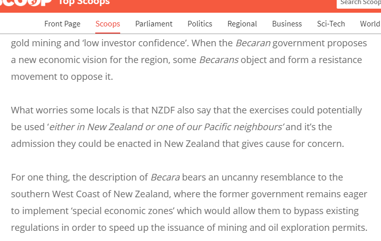 However the means to control and cease national parks without public consultation emerged during the Military (Fie Eyes) exercise Southern Katipo 2017 when West Coast National Parks were requisitioned by the military and declared off-limits to locals, while troops conducted armed exercises around the shopping area, on domestic streets, in rural areas within the Kahurangi National Park where mining and road blasting is sought by big business interest. Forest and Bird chief executive Kevin Hague said in July 2017 that documents released under the Official Information Act indicated that ‘the scope of law and regulation that the government is proposing to suspend, to facilitate these developments, is “breath-taking”.