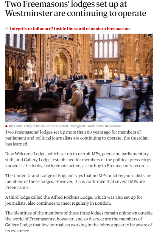 The Guardian lay the blame for this at the feet of two specific lodges (as opposed to blaming all of freemasonry) “set up to recruit at the Palace of Westminster who are continuing to operate: one established for members of parliament and staff in the Commons and Lords, and the second for political journalists”