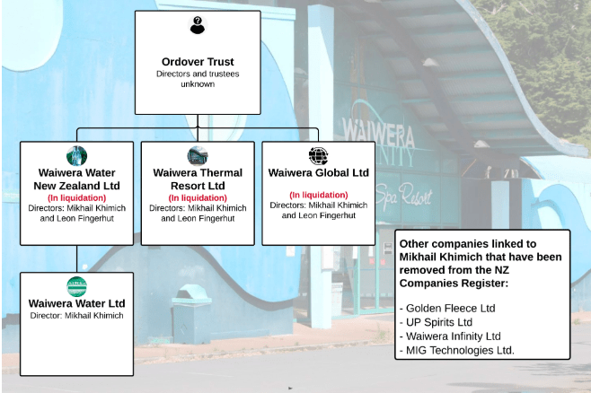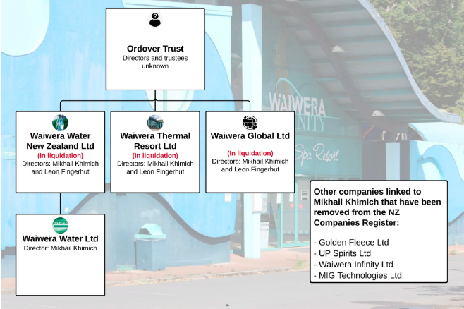 In 2017 Russian Oligarch Khimich whose cohorts include Cyber oligarch Kim Dotcom invested in NZ water industry in Waikato specifically investing in Ordover Trust and subsidiaries Waiwera water, Waiwerea Thermal Resort Ltd, Waiwera Global, Waiwera Water Ltd, plus Waiwera Infinity Ltd, Robert Graham Institute Natural Waters which were listed to his home address or to 21 Waiwera Rd Waiwera Auckland. The crown of this liquid gold mine was the Waiwera water which has since been placed into liquidation in October 2019 and is subject to at least one investigation (from the NZ Companies Office) due to financial irregularities.