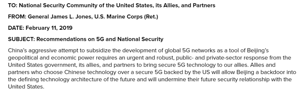 A plan based on General James Jones the former commander of NATO belief that 5G, Space and AI combined will be the tools which lead America to dominate China in the new century — Recommendations on 5G and National Security Strategic Insights Memo by James L. Jones,
