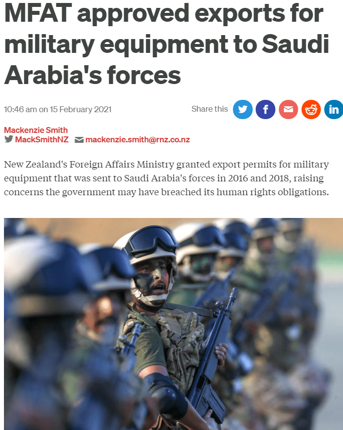 Weapons which include NZ arms New Zealand’s Ministry of Foreign Affairs and Trade (MFAT) approved export permits for military equipment that was sent to the United Arab Emirates (UAE), one of Saudi Arabia’s partners in the war in Yemen, in 2018 and 2019