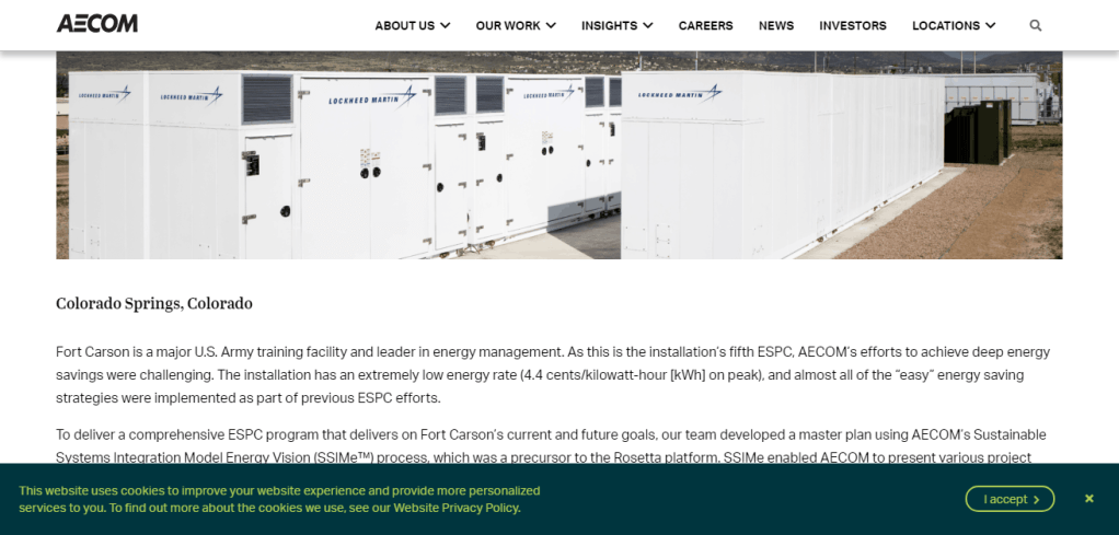 The Helen Clark Foundations financial patrons include WSP AECOM, a construction a technology firm specialising in global infrastructure firm, who announced in August 2019 that it has begun construction of a Battery Energy Storage System (BESS) at Fort Carson, Colorado, using Lockheed Martin’s (NYSE: LMT) GridStar® Lithium energy storage system.
