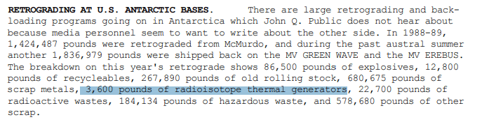 More than a 45 portable American and Russian nuclear reactors have being removed from Antarctica in 2019, with at less one malfunctioning. New Zealand Owen Wilkes in the national archives also documents in his papers how a similar malfunction in Greenland melted a hole in the ice during the 1970’s and the contaminated area was simply permitted to freeze over. Issue one of DEADLINE 2003, based on official information document identified the MV Greenwave as bring back waste from a US reactor allegedly damaged in 1991. This 1990 report by the Antarctic Society also confirms the Green Wave carried nuclear waste a claim denied during my 2003 investigation, by the National Radiation Labratory.