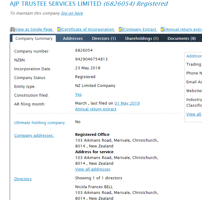 The Press says the properties are co-owned by an individual named Nicola Frances Bell. Bell is sole shareholder of AJP Trustee Services and her registered address is the Merivale property. Bell is also a director of AJP Trustee Services with Anna Fox. AJP Trustee Services has a registered address at Christchurch law firm Saunders Robinson Brown (SBR), where Fox works as managing partner. She is a busy ladyher company directorships take about six pag on the company offices website.
