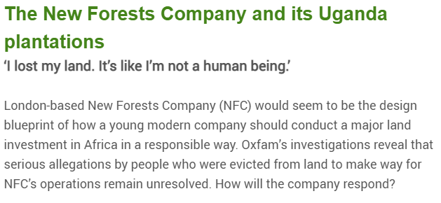 However New Forest Company is accused separately by Oxfam of exploiting intimidating workers, displacing 22,000 indigenous tribes people and off scamming carbon credits in a virtual ponzi trade as they rort the carbon trading scheme and climate loans then get diverted to buy weapons.