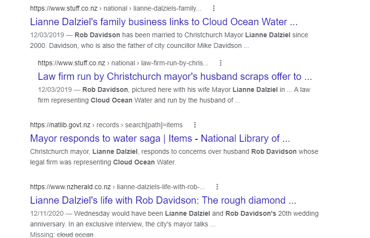 Mora invested heavily in the Christchurch real estate market and owns numerous properties including West Kilmore Precinct whose neighbour coincidentally include Christchurch law firm Saunders Robinson Brown (SBR), where Anna Fox the director of AJP Trustee Services used by Credit Suisse merchant banker to launder stolen aid money into New Zealand’s lucrative property market works as managing partner. Mora also owns property in Cramner Square where the re-elected mayor of Christchurch Lianne Dalziel has just moved into a new residence. Mora’s Christchurch property developer partners are also believed to have an interest in the burgeoning water market which Christchurch Mayor has her self had to admit failure (forgotten largely due to the tragedy of the Christchurch attacks), after not disclosing a family connection to water bottler Cloud Ocean Water, admitting there was a conflict of interest she “should have managed”. Dalziel husband Rob Davidson an ex Catholic naughty borstal boy turn lawyer (Laziel’s “diamond in the rough”) practice Davidson Legal, was representing Cloud Ocean and had offered to use “personal contacts to lobby politicians”. That offer has since been revoked so Dalziel maintains. Dalziel conceded there was a conflict of interest over her knowledge about her husband’s work, admitting she should have told colleagues. Dalziel however maintains she and her husband keep their work separate and had not planned to use her reputation to procure business. Davidson & Associates continued after that statement to advertise on the company’s own web site “Rob is married to Lianne Dalziel, the mayor of Christchurch, who was a former member of Parliament for Christchurch East, and a former Minister of Immigration and Commerce”.