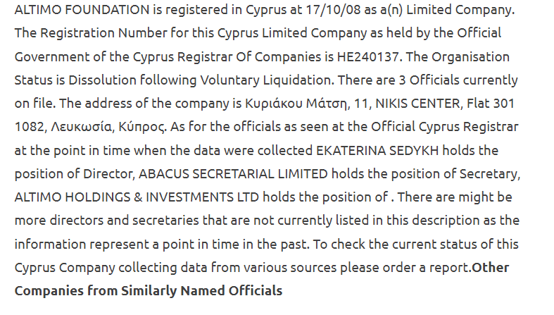 Altimo is listed in the Panama Papers in relation to links to the assassination of Maltese journalist Daphne Anne Caruana Galiziand her investigation of Maltese front companies tied to Russian organised crime and shady Cypress banking and Dubai investors affiliated to the Azerbaijani Laundromat.