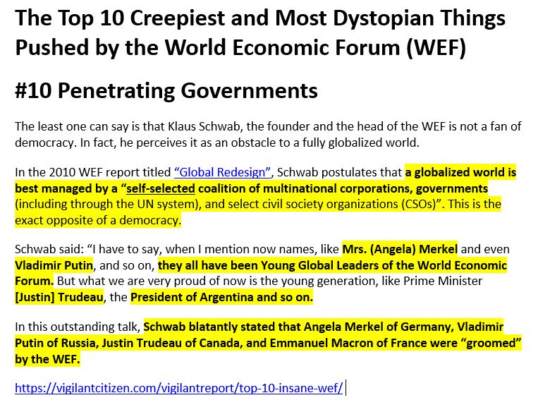 as “the most comprehensive proposal for re-designing global governance since the formulation of the United Nations during World War II. …Who are these other, non-governmental stakeholders? The WEF, best known for its annual meeting of high-net-worth individuals in Davos, Switzerland, describes itself as an international organization for public-private cooperation. WEF partners include some of the biggest companies in oil (Saudi Aramco, Shell, Chevron, BP), food (Unilever, The Coca-Cola Company, Nestlé), technology (Facebook, Google, Amazon, Microsoft, Apple) and pharmaceuticals (AstraZeneca, Pfizer, Moderna)”