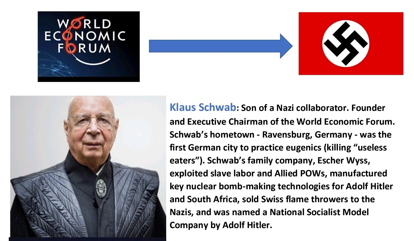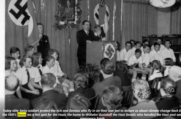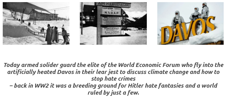 That Davos is not just a group of rich dudes, who really do have your best interest at heart as they gripple with the big topics such as climate change and diversity in a town that was at the centre of an ideology which inspired mass murder and world domination. The very idea of picking a town like Davos, with its blood ties to one of the anti democratic regimes in history, to discuss the what the future of mankind might be and how it will be ethically guided, demonstrates a profound lack of self-awareness. One matched perhaps only by the idea that somehow flying to a climate change conference (at a location not only once a Nazi hub but run on artificial heating and furnaces) will go down well with the wider public. Its a red flag that in fact where dealing with a group of people who just like the Nazis are dangerously disconnected from reality and motivated by narcism. Their does not have to a physical direct conspiracy and it is to a degree moot as to whether Davos and Schwab still maintains living ties with the Neo Nazi (or other overtly fascist organisations).