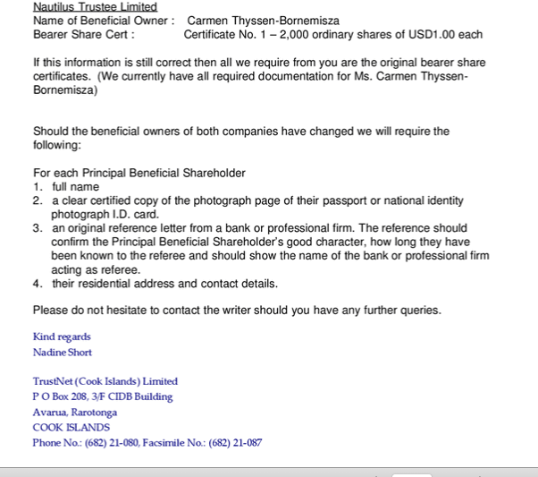 Documents obtained by the International Consortium of Investigative Journalists show how Thyssen-Bornemisza built her collection buying art from international auction houses such as Sotheby’s and Christie’s through a Cook Islands company. The offshore service provider now called Portcullis TrustNet helped with the arrangements under a secretive structure that connected people in as many as six different countries*1.