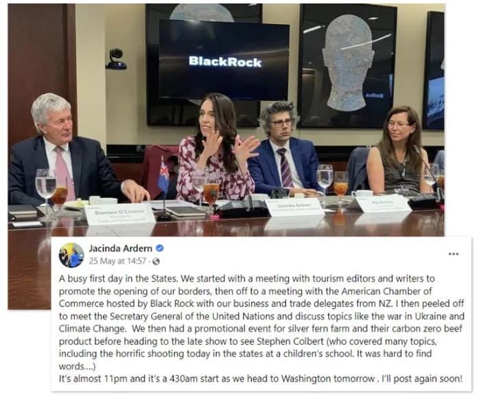 Post shooting wowed by Black Rock lobbyists and wooed by the UN ESG partner Ardern the 34-year-old communication specialist for Tony Blair’s Better Business Bureau (which promoted public private partnerships) made an “elevator pitch” to Black Rock at its New York office. She would tell them exactly what they wanted to hear – Black Rocks people, ensconced in organization like the New Zealand American Chambers of Commer (who also promoted the idea of the TPPA and NZ being luxury lodge haven for bolt hole billionaires) having basically written Ardern’s briefing notes on ESG to start with. It comprises of firms including IBM, Google, ANZ, Air NZ, Amazon, Microsoft,Pfeizer, Lockhed Martin, Fonterra, HSBC, Tai Nui and Ngai Tahu,