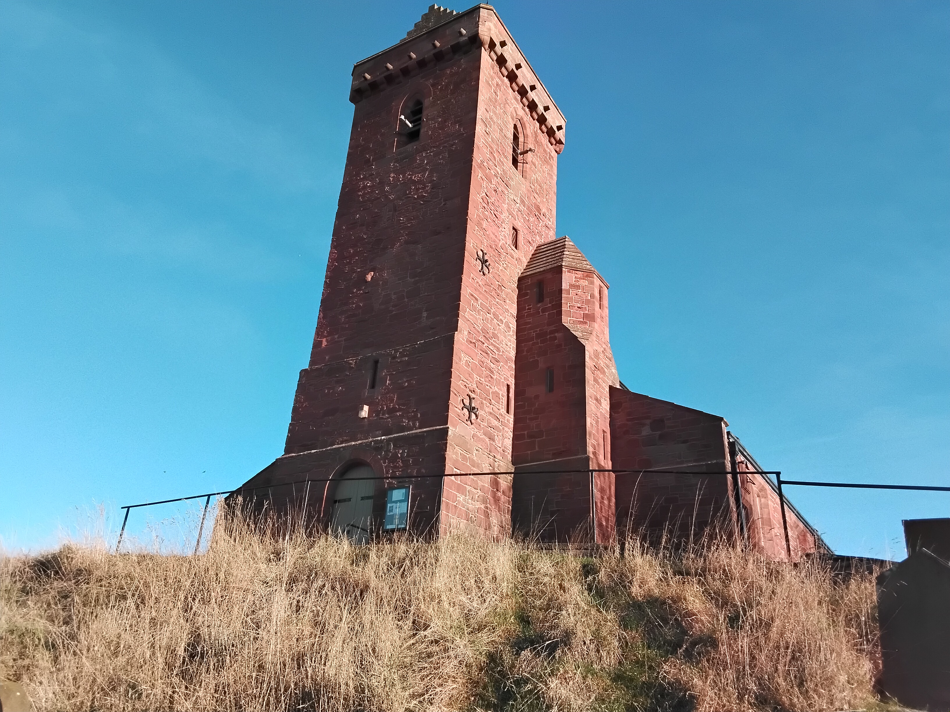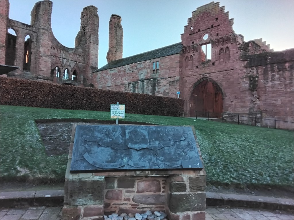 Built of the local red sandstone, it was a large and impressive example of a Scottish medieval parish kirk. Its situation on top of a prominent, steep-sided mound (presumably of glacial origin, though doubtless ‘improved’ by landscaping) which is striking but soon gets one winded as you walk up and down the frozen but still boggy hillside.