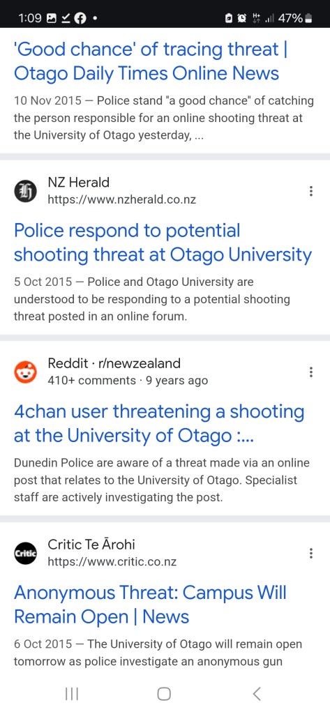 2015 Otago University shut down due to threats made on 4chan 8chan by an individual with potentially the same linguistic signature as shooter according to Auckland University.